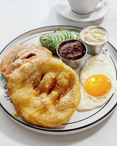 acompañadas con crema, miel, huevo al gusto y frijolitos fritos