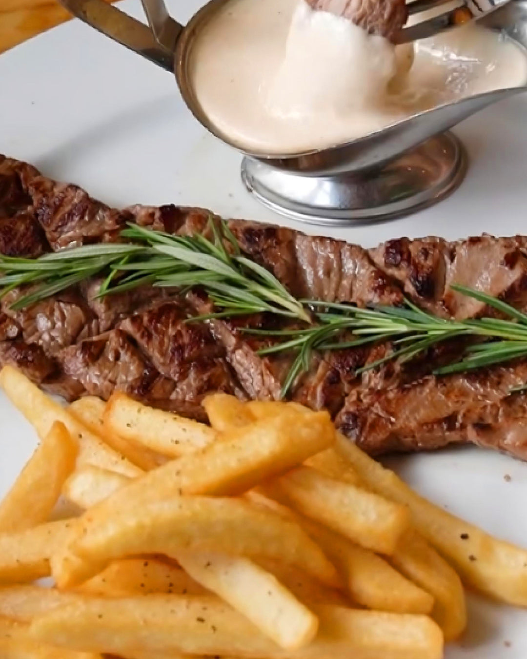 Delicioso corte de filete de res, acompañado de papas fritas, salasa alioli y ensalada.